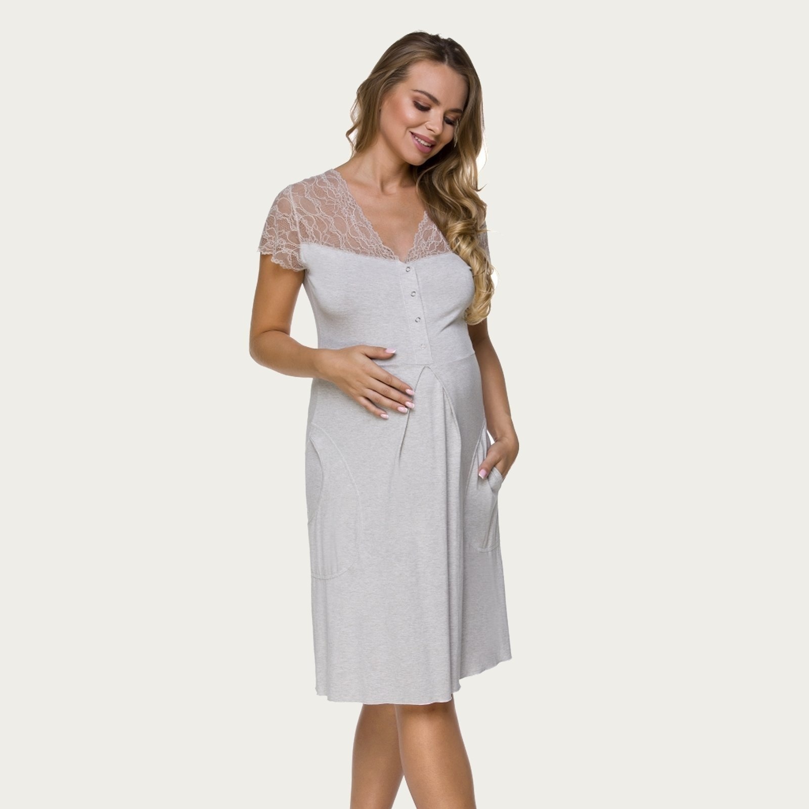 Een heerlijk zacht en sexy zwangerschapsjurkje van Lupoline. De jurk is grijs met kant en heeft knoopjes aan de voorkant voor het voeden.